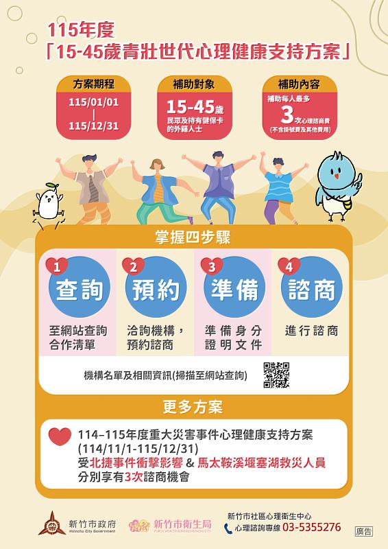 (中央社訊息服務20260223 11:16:38)為鼓勵青壯世代正視心理健康,協助調節生活壓力與負面情緒,新竹市政府自今(115)年1月1日起,持續配合衛生福利部推動「15至45歲青壯世代心理健康支持方案」,提供符合資格民眾每人3次免費心理諮商服務,目前全市共有19家醫療機構共同參與,民眾只需透過「查詢、預約、準備、諮商」四個簡單步驟,即可輕鬆完成免費心理諮商,協助及早覺察自身心理狀態、主動尋求專業支持,達到預防介入、降低心理風險的效果。