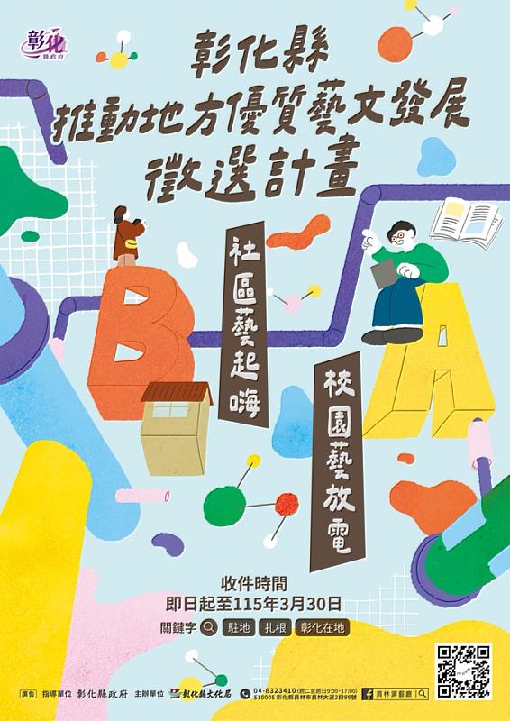 (中央社訊息服務20260223 12:28:27)「彰化縣推動地方優質藝文發展徵選計畫」開跑!即日起至今(115)年3月30日止受理報名,預計徵選4至8團地方優質藝文團隊,將藝文能量導入校園與社區巷弄,促進地方與藝術表演共榮共生。誠摯邀請本縣及全國優秀的藝文團體踴躍投件,攜手共創在地藝文的嶄新風貌。