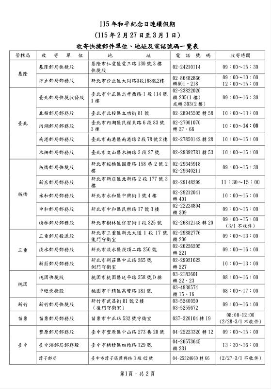 (中央社訊息服務20260223 12:30:25)115年2月27日至3月1日和平紀念日連續假期,各地郵局營業窗口僅臺北故宮郵局營業,提供外幣兌換、各類集郵票品與代售商品販售服務,其餘郵局一律停止營業。