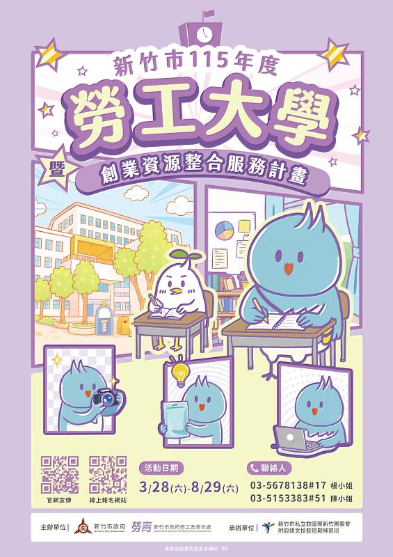 (中央社訊息服務20260223 13:16:04)新竹市勞工大學課程報名正式起跑!為強化勞工競爭力,115年度勞工大學將於2月24日10時開放報名,所有課程完全免費,歡迎15歲以上勞工與青年朋友踴躍報名。市長高虹安表示,今年度課程設計緊扣產業脈動,透過系統化的學習資源,協助勞工與青年朋友在瞬息萬變的職場環境中穩步成長,不僅提供職能進修的機會,更打造支持市民自我實現的友善學習平台。