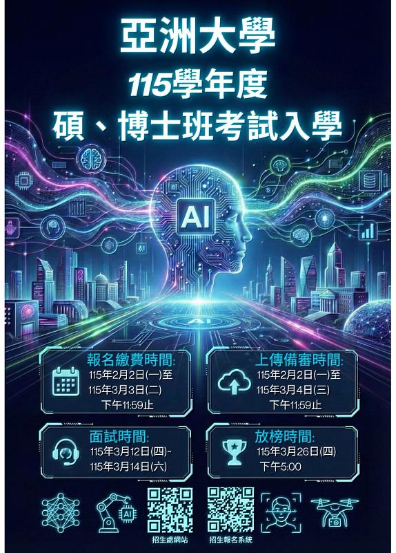 亞洲大學強調,未來將持續深化跨域人才培育,打造中台灣高階人才培育基地,歡迎有志進修之學生踴躍報考,報名日期為即日起至115年3月3日截止。