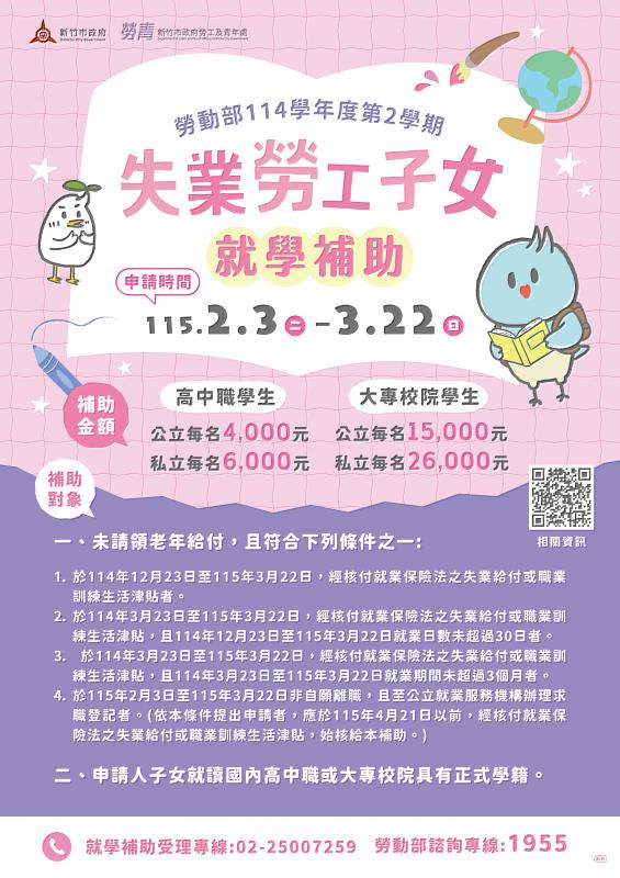 (中央社訊息服務20260225 14:03:32)勞動部114學年度第2學期「失業勞工子女就學補助」正式受理申請,市長高虹安表示,教育是翻轉未來的關鍵,政府開辦補助的初衷,是為了在勞工朋友面對工作轉換的艱難時刻,及時提供經濟支持與溫暖,確保每位學子不因家庭職涯變動而影響受教權。市府積極配合推廣中央補助資源,提醒符合資格的市民朋友務必於3月22日截止日前提出申請。
