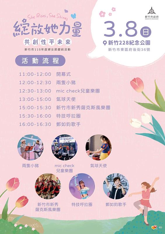 (中央社訊息服務20260225 14:21:19)國際婦女節即將到來,新竹市政府將於3月8日11時至17時在新竹228紀念公園舉辦「綻放她力量-共創性平未來」115年婦女節慶祝活動,將結合姊妹市集、舞台表演、療癒體驗活動及首度推出的「女路」走讀行程,邀請市民朋友攜家帶眷一同參與,共度溫馨愉快的婦女節時光。