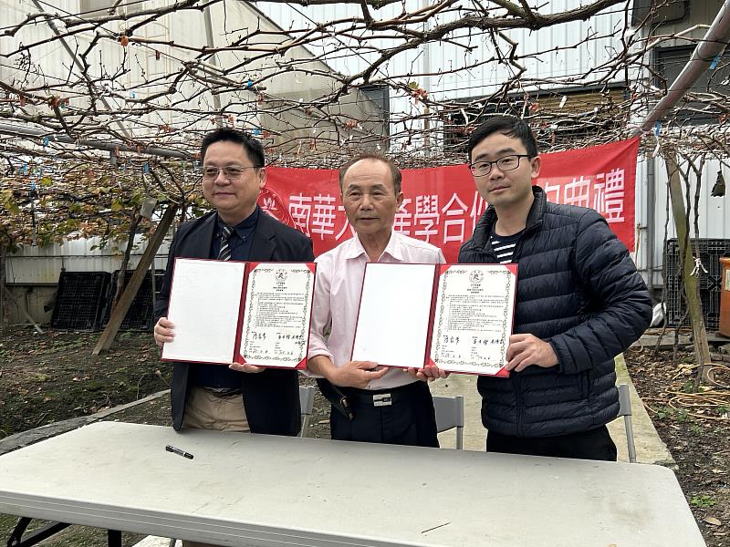 (中央社訊息服務20260225 15:09:47)因應氣候變遷對農業生產所帶來的衝擊,南華大學科技學院於2月6日與彰化縣大村鄉美香農場簽訂合作意向書(MOU),並在葡萄園棚架下完成簽署儀式,象徵學術研究與農業實務深度結合,期望透過學術研究、產業實務與官方輔導的整合,為葡萄及多元作物面對極端氣候所衍生的生長問題,尋求具體可行的解方,進而協助農場發展農特產品、提升農業附加價值。