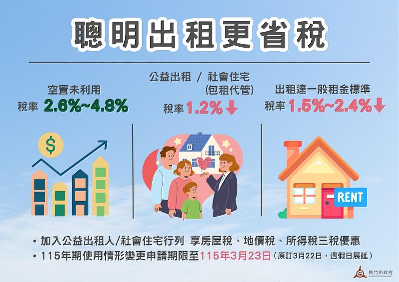 稅務局舉例,林先生全國僅持有1戶非自住住家用房屋,位於新竹市,房屋評定現值為新臺幣100萬元。若長期空(閒)置未使用,適用稅率2.6%,每年須繳納房屋稅2萬6千元;若將房屋出租,並申報租賃所得達當地一般租金標準,稅率降為1.5%,每年稅額降為1萬5千元;若成為公益出租人或參與社會住宅包租代管,稅率進一步降至1.2%,每年僅需繳納1萬2千元,與空屋相比,一年可節省1萬4千元稅負。