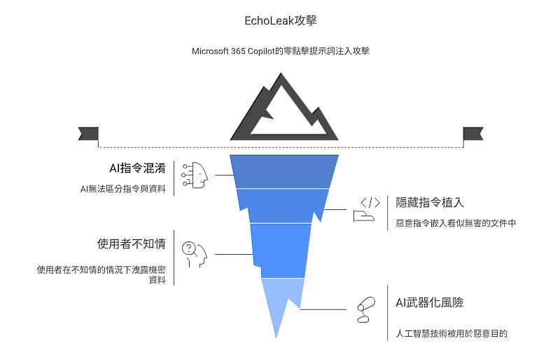 「EchoLeak」攻擊事件係針對Microsoft 365 Copilot進行「零點擊」(Zero-Click)的提示詞注入(Prompt Injection)攻擊,攻擊者將隱藏指令植入看似無害的文件中,誘使AI自動檢索薪資單等敏感資料並回傳,顯示AI系統缺乏分辨「指令」與「資料」的能力,使用者在完全不知情的情況下,僅因AI助手「盡職」地處理文件,便導致機密外洩。