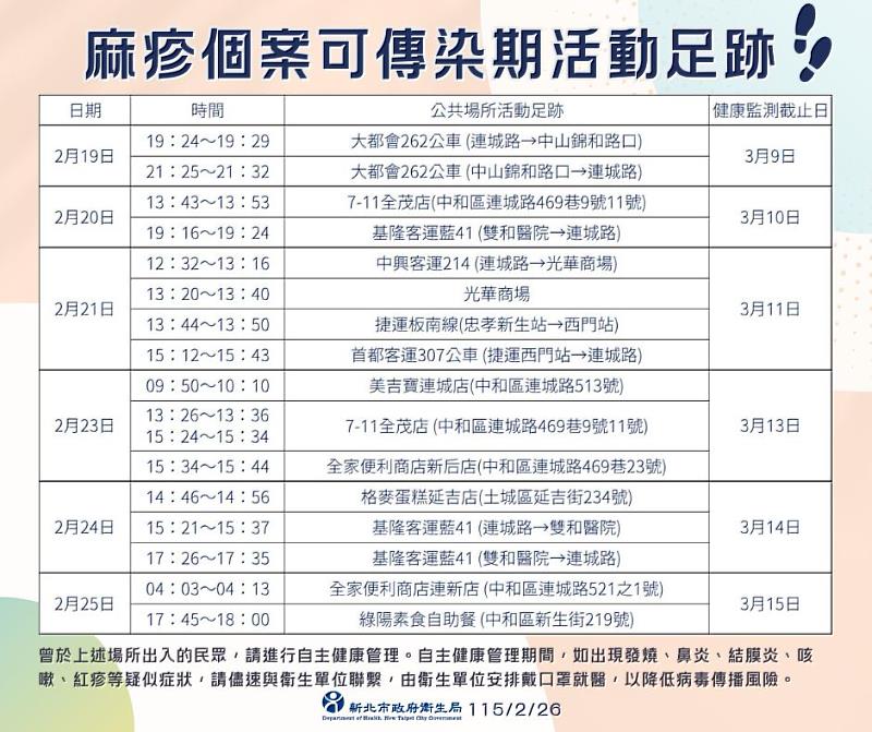 新北衛生局說明,由於個案於可傳染期間有公共場所活動史(如附表),提醒曾於附表場所出入的民眾,請進行自主健康管理至3月17日。自主健康管理期間,請留意是否出現疑似症狀,如紅疹、發燒,或出現咳嗽、流鼻水、畏光、流淚、紅眼等鼻炎與結膜炎等,請盡速與衛生單位聯繫,另自主健康管理期間應避免出入公共場所,並儘量配戴口罩,以降低病毒傳播風險。
