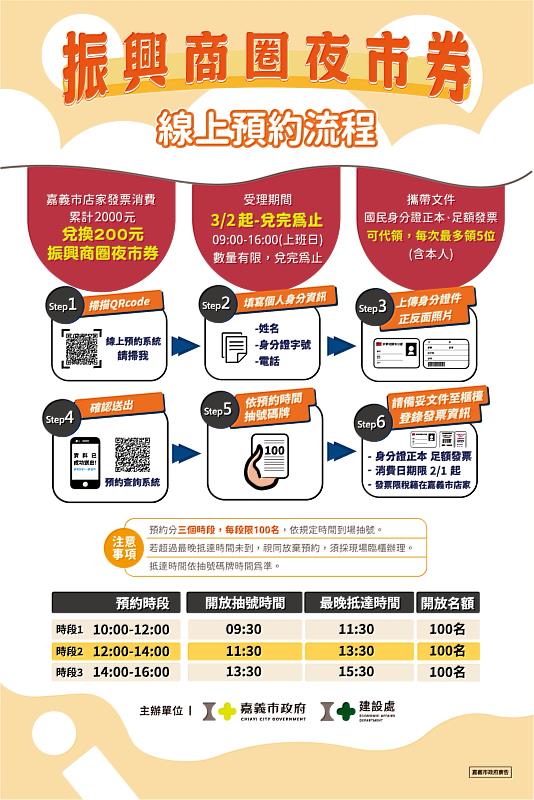 為減少排隊時間,市府同步推出線上預約服務,民眾可提前3天至活動網站預約辦理時段,並可即時查詢叫號情形及當日剩餘兌換金額,掌握最新資訊。活動名額有限,兌完為止,歡迎全國民眾把握機會來嘉義市消費旅遊,讓消費有回饋、好運再加碼。更多活動詳情,請至振興商圈夜市券官方網站(https://www.chiayistimulusplan.com.tw/)及2026嘉義市振興商圈夜市券粉絲專頁(https://www.facebook.com/Chiayirevitalize/)查詢。
