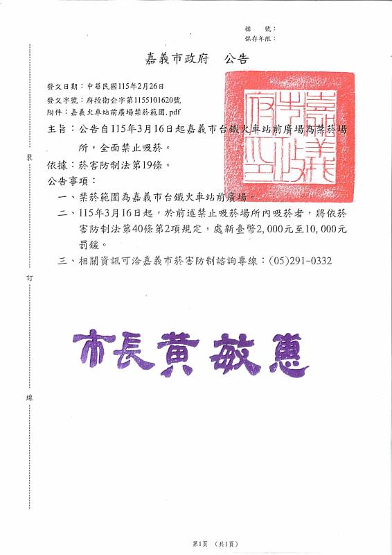 (中央社訊息服務20260303 11:22:49)為營造無菸健康環境並維護市民與旅客通行品質,嘉義市政府公告自115年3月16日起,嘉義車站前廣場全區正式實施禁菸措施,請民眾進入廣場範圍內不得吸菸,違者最高可依菸害防制法裁罰新臺幣10,000元罰鍰。