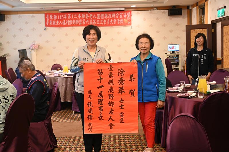 會中並頒發紅榜祝賀鹿野鄉老人會第11屆新任理事長涂秀琴女士當選,她表示,非常榮幸在這盛大場合中接受這份榮耀,象徵責任傳承與服務接棒。臺東縣老人福利推動聯盟王欽鈴理事長也期許與在座各老人團體理事長帶領下,持續凝聚長者力量,深化福利服務,攜手建構更友善的高齡環境。