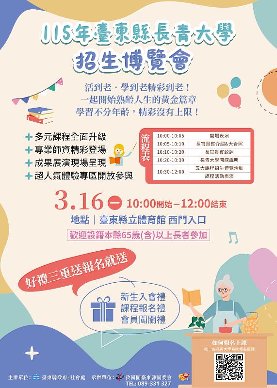 為鼓勵年滿65歲以上熟齡族群持續學習、拓展人際互動並提升生活品質,臺東縣政府將於3月16日在臺東縣立體育館舉辦「臺東縣長青大學招生博覽會」,參加對象為設籍臺東縣且年滿65歲以上長者。縣府表示,博覽會以「全面升級・精彩加倍」為主軸,透過課程展示、體驗活動及現場諮詢服務,協助長者深入了解升級後的長青大學2.0學習資源,並推出新生入會禮、課程報名禮及會員闖關禮三重好禮,鼓勵長者走出家門參與學習,培養興趣專長,開啟精彩充實的樂齡生活。