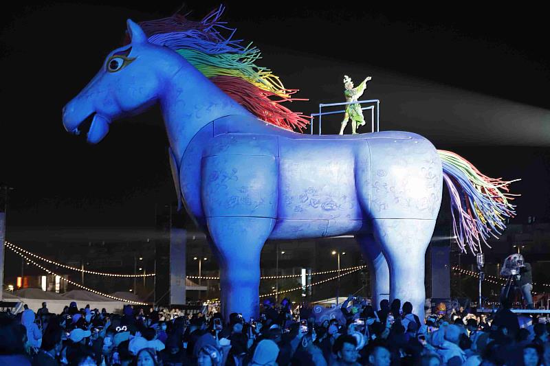(中央社訊息服務20260306 10:09:02)2026台灣燈會,紙風車劇團大型親子劇「雨馬」震撼演出,超過3層樓高的巨型藝術裝置踏著流動光影緩緩前行,彩虹鬃毛在夜色中閃耀奪目,結合舞台演出、火舞特效與沉浸式影像設計,為嘉義燈會增添驚喜與感動。