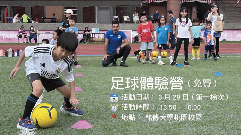 (中央社訊息服務20260306 11:09:34)銘傳大學足球俱樂部將於3月29日在桃園校區舉辦「銘傳足球體驗營」第1梯次活動,開放在地孩童免費參加,邀請孩子走進校園,在專業場地與教練帶領下體驗足球運動,透過遊戲與分組活動培養運動興趣與團隊合作精神。