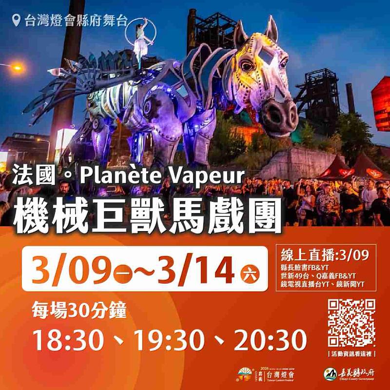 (中央社訊息服務20260309 09:59:09)來自法國的機械藝術馬戲團 Planète Vapeur 即將在2026台灣燈會震撼登場,攜代表作「飛天白馬秀」首度於嘉義亮相,以巨型機械裝置結合當代馬戲語彙、現場音樂與聲光科技,為城市夜空揭開壯闊而奇幻的藝術序幕。