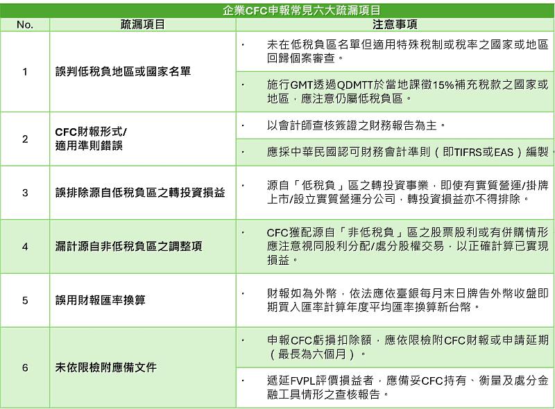 (中央社訊息服務20260310 10:52:16)CFC制度自112年度施行以來,企業辦理申報CFC投資收益即將邁入第3年,CFC申報已成為稅務遵循中不可忽視的重要環節。勤業眾信聯合會計師事務所國內稅務負責人張瑞峰資深會計師今(10)日分享,隨著企業陸續展開新年度營所稅結算申報作業,以下彙整理企業CFC申報常見的6大疏漏項目,協助企業提前自我檢視申報重點,以期在報稅期間更完整遵循CFC法規,降低未來與稽徵機關間稅務爭議之風險。