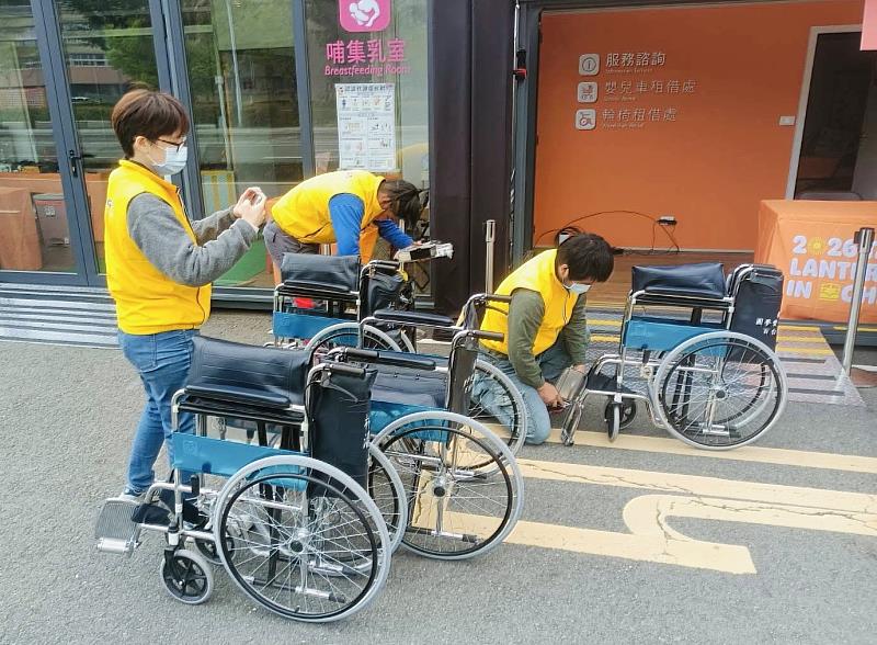 社會局說明,燈會期間借用需求踴躍,部分輪椅設備陸續出現耗損,嘉義縣輔具資源中心接獲通知後即派遣專業維修技師前往燈區服務站進行檢修與維護,在開園前完成設備整備作業,迅速排除相關問題,確保輪椅功能正常,持續提供借用服務。
