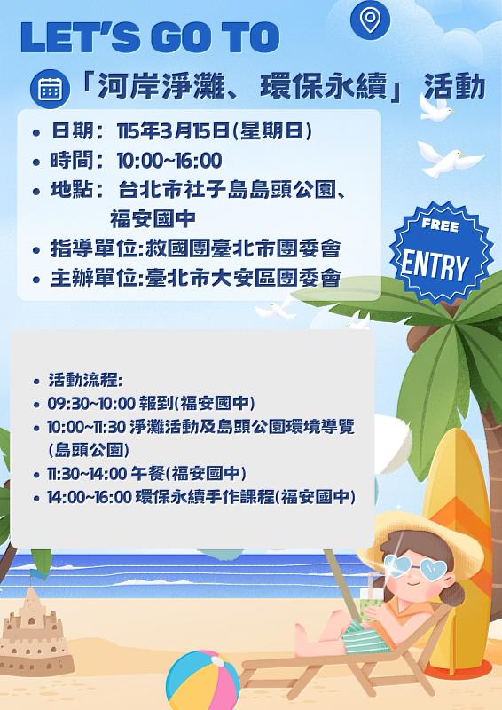 為響應環保與永續發展理念,臺北市大安區團委會主辦「河岸淨灘、環保永續」活動即將於115年3月15日(星期日)在臺北市社子島島頭公園及福安國中盛大舉行。活動時間為上午10點至下午4點,誠摯邀請熱愛環保民眾共襄盛舉。