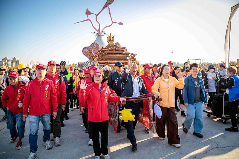 翁章梁感謝媽祖聽到他的心聲,庇佑燈會開幕及遊行順利,今天邀請媽祖賞燈,很多人把願望打在主燈牆上,希望媽祖庇佑完成願望,也保佑嘉義轉型成功,希望台灣的光可以一直點亮嘉義。