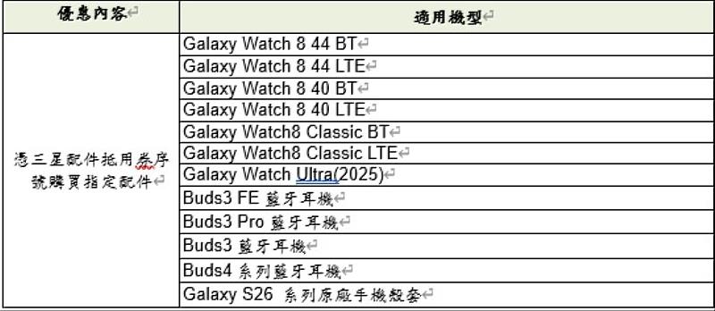 5. 三星穿戴配件加購優惠限於中華電信各地服務據點及神腦特約服務中心辦理,活動時間自115/03/13-115/04/30,購買Galaxy S26旗艦系列手機,持商品抵用券可享下列穿戴裝置加購優惠;抵用券請於購買S26系列手機產品之原門市使用,如遇手機退貨,合購商品須一併退還。如無法退還,主辦單位有權要求用戶以原價買下所加購之商品。一組兌換序號僅可使用一次。一台手機可加購一只手錶和一組耳機。