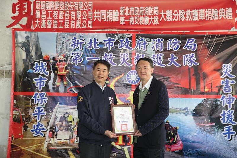 事實上,賴金龍執行長與何易學副董事長長期支持消防救護工作。自113年起,即與蘇真女士及勝輝地產開發股份有限公司共同捐贈海山分隊救護車,並命名為「寶珠號」,以紀念母親;114年再捐贈鏟式擔架及影像式插管喉頭鏡等設備,總價值約100萬元,用於更新板橋轄內救護車醫療裝備;115年再度慷慨捐贈大觀91高頂救護車,持續以實際行動支持消防救護工作,展現企業回饋社會、守護市民安全的責任與情懷。