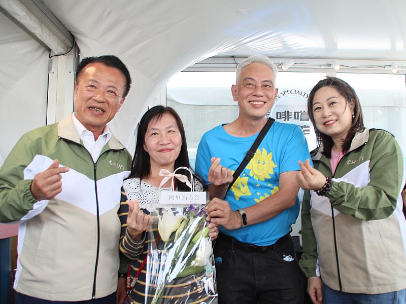 縣長翁章梁也驚喜現身活動現場,親自為民眾送上百合花束,與現場情侶及夫妻互動合影。翁章梁表示,希望透過燈會活動讓更多人認識嘉義優質咖啡與阿里山特色農產,也祝福大家白色情人節快樂,在燈會中留下甜蜜難忘的回憶。