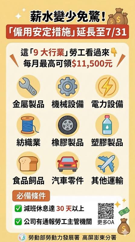 勞動部高屏澎東分署(簡稱高分署)表示,只要是受僱於食品及飼品、紡織、橡膠製品、塑膠製品、金屬製品、機械設備、電力設備及配備、汽車及其零件,以及其他運輸工具及其零件等「9大製造業」的勞工,若與雇主協議減班休息達30天以上並完成通報,每人每月最高可獲新台幣1萬1,500元補貼,最長可領取6個月。