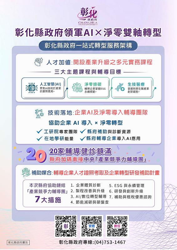 縣長王惠美致力推動「2050淨零轉型」,打造彰化成為低碳智慧城市,協助產業面對碳關稅與ESG規範挑戰。AI 與淨零是提升產業競爭力與永續發展的關鍵;縣府將持續整合教育與輔導機制,透過企業AI淨零診斷、重點產業輔導及辦理說明會等方式,協助企業掌握中央補助與租稅利多,將診斷轉為可執行的補助計畫與投資抵減。縣府提供單一窗口,欲參與課程、申請診斷或進一步瞭解中央「產業競爭力輔導團」與擴大租稅優惠等補助措施,請掃描 EDM QRcode,或洽服務專線(04)753-1467,將有專人協助。