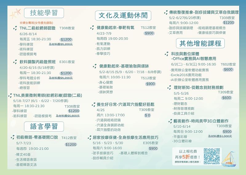 社會處進一步說明,夏季班特別開設婦女專班(婦女優先錄取)「二級紋綉師認證」課程,協助女性勞工培養專業技能並取得認證,提升就業及創業競爭力;技能學習類開設「TNL二級紋綉師認證」、「飲料調製丙級證照班」及「TNL美業微刺青師認證」等課程,協助學員培養專業技術並取得相關證照;語言學習類推出「初級韓語-零基礎開口說」,透過基礎發音與生活情境會話練習,逐步建立語言能力;文化及運動休閒類規劃「基礎瑜珈與頌缽」、「拳擊有氧」、「穴道耳穴指壓保養」、「居家按摩保健」及「刮痧拔罐與艾草自我調理」等課程,協助學員紓壓放鬆並建立健康生活型態。此外,在其他增能課程方面,也開設「Office實務與AI智慧應用」、「理財新知-從觀念到財務規劃」及「時尚美甲3D立體創作」等課程,滿足不同族群的多元學習需求。