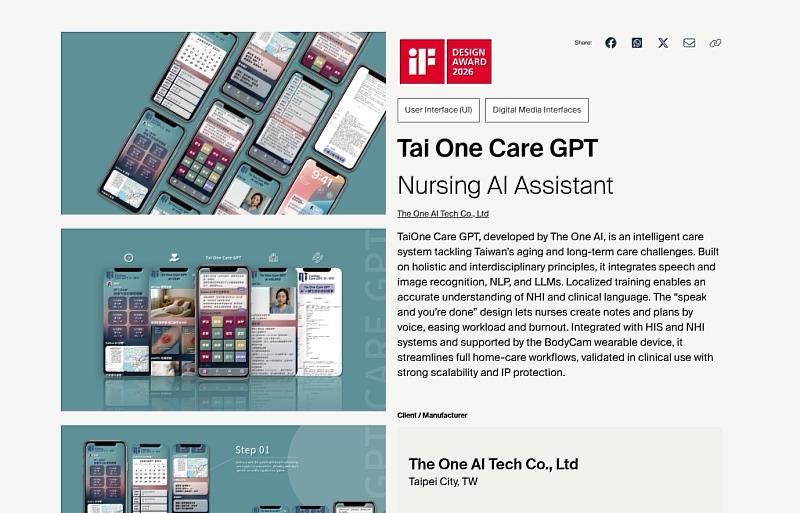 (中央社訊息服務20260325 14:11:05)臺灣智慧醫療實力,再度驚豔國際!2026年德國iF設計獎(iF DESIGN AWARD)得獎名單揭曉,醫療AI新創本一科技(The One AITech)核心系統「臺醫照護GPT」(TaiOne Care GPT)憑藉使用者體驗設計與臨床應用實例,於全球68國、逾萬件參賽作品中脫穎而出,獲得UI使用者介面類別獎項。此外,本一科技技術長、奇美醫院教學部部長廖家德亦因推動智慧醫療轉型,2025年底獲頒資訊月「傑出資訊人才獎」,今年3月更獲總統賴清德親自接見。本一科技屢次奪下國內外殊榮,不只將前瞻AI技術轉化為臨床解方,也在全球數位轉型浪潮中,勾勒出「全域智慧照護」新藍圖。