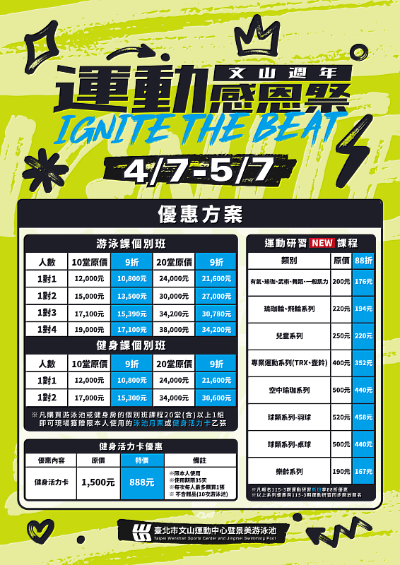 在現代生活節奏快速、久坐成為常態的情況下,「運動」不再只是選項,而逐漸成為維持身心平衡的重要關鍵。臺北市文山運動中心迎來成立週年,以「IGNITE THE BEAT」為主軸,推出「運動感恩祭」系列活動,於115年4月7日至5月7日限時展開,期望帶動市民重新啟動身體節奏,找回屬於自己的運動頻率。