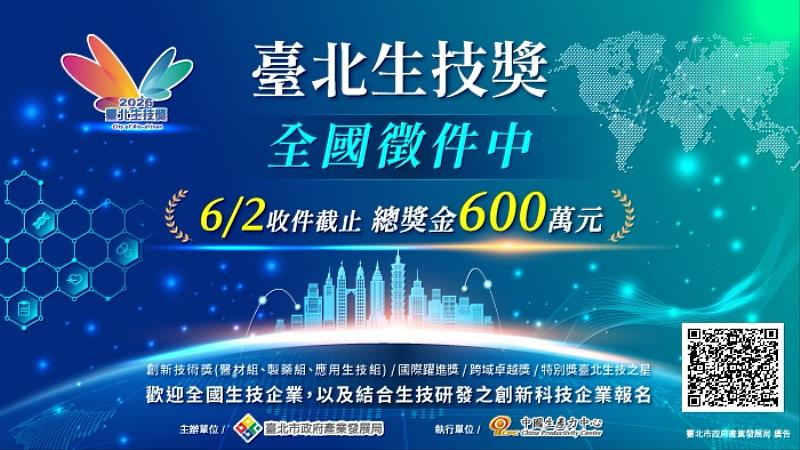 「臺北生技獎」邁入第23屆,為全國唯一由政府主辦、免報名費且總獎金最高之生技競賽,透過嚴謹審查機制發掘具創新量能與市場潛力之優秀企業單位,累計頒發逾300件績優標的、總獎金達1.2億元。歷屆得獎企業如仲恩生醫積極推進幹細胞新藥臨床二期並進軍日本、安基生技推進罕見疾病新藥臨床並布局孤兒藥、台康生技生物相似藥取得歐美法規進展,展現卓越發展成果,臺北生技獎已成為生技產業典範指標,也是企業展現品牌價值之最佳利器。