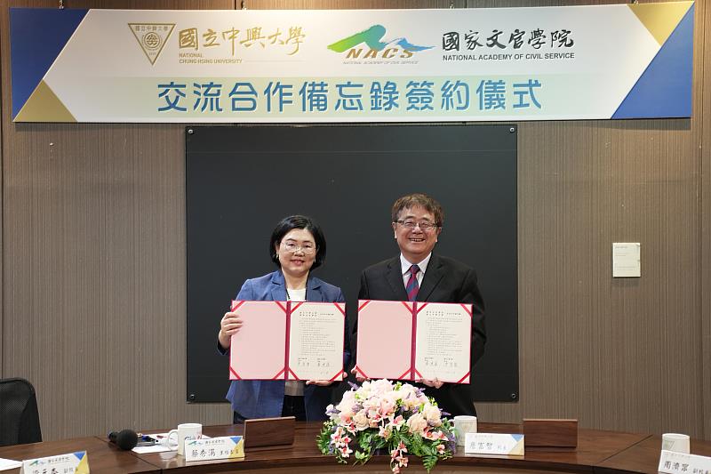 (中央社訊息服務20260327 12:02:38)國立中興大學與國家文官學院於3月25日舉行交流合作備忘錄簽署儀式,由興大校長詹富智與保訓會主委兼國家文官學院院長蔡秀涓代表簽署,雙方將深化高等教育與公務人員培訓體系之交流合作,建立長期合作夥伴關係,透過資源整合與專業交流,提升人才培育品質與培訓效能,為國家公共治理發展注入新動能。