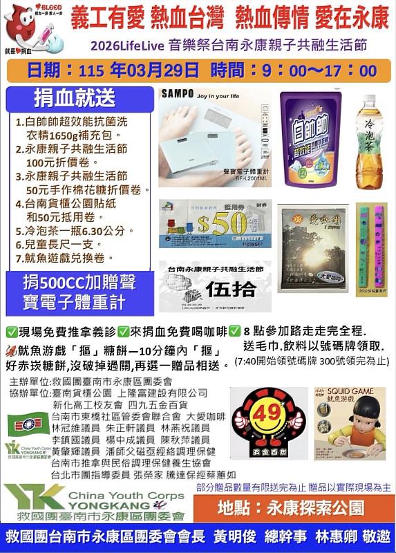 為響應公益捐血、推廣親子共融與健康生活理念,救國團台南市永康區團委會與台南市東橋管委會聯合會將於3月29日(星期日)上午9時至下午5時在永康探索公園舉辦「2026 Life Live音樂祭台南永康親子共融生活節」,結合熱血捐血行動與多元親子活動,邀請民眾攜家帶眷,共度充滿愛與活力的一天。