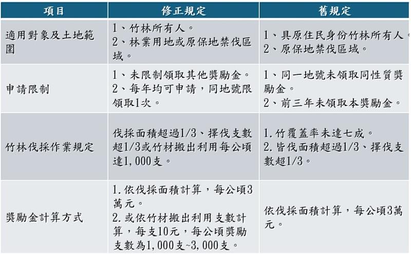 (中央社訊息服務20260330 12:02:01)為活絡竹材生產與竹產業發展,農業部已公告修正「竹林生產更新獎勵作業規範」,將原本僅以原住民保留地禁伐區域為對象的獎勵,擴大至所有林業用地,大幅擴大獎勵適用對象;並將原本只單純鼓勵伐採更新,調整為兼具竹林經營、竹材生產及產業利用之獎勵制度。只要以孟宗竹、桂竹、長枝竹、莿竹、轎篙竹等經濟竹種為栽培竹種,均可納入獎勵範圍,鼓勵竹林所有人投入經營與更新,帶動整體竹材供應量能,並提升環境公益價值。