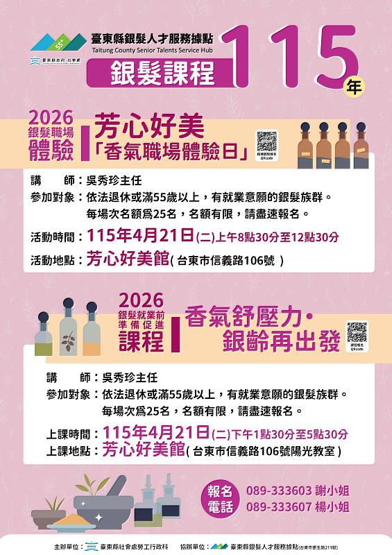 臺東縣政府為推動銀髮族再就業與終身學習,將於4月21日在芳心好美館辦理「芬芳綻放:用香氣開啟第二職涯新篇章」系列課程,結合香氛體驗與職場實務,協助55歲以上民眾培養實用技能並強化心理調適能力。活動分為上午「香氣職場體驗日」及下午「香氣舒壓力・銀齡再出發」2場次,每場限額25人,報名額滿為止,歡迎有意再就業或培養第二專長的民眾把握機會踴躍報名參加。