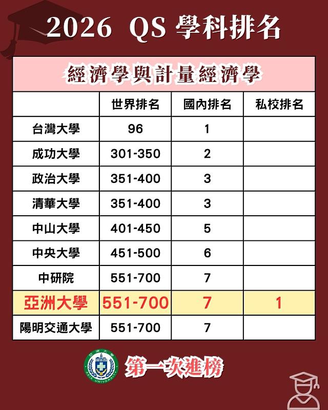 在「經濟學與計量經濟學」領域,亞洲大學為首次進入QS學科排名,落在全球第551-700名區間,直接與中央研究院、陽明交大等頂尖學術機構並駕齊驅,並列全國第7,並光榮奪下全台私立大學第1!這項傲人成績,印證了本校商管與經濟領域的研究實力已具備世界級水準。