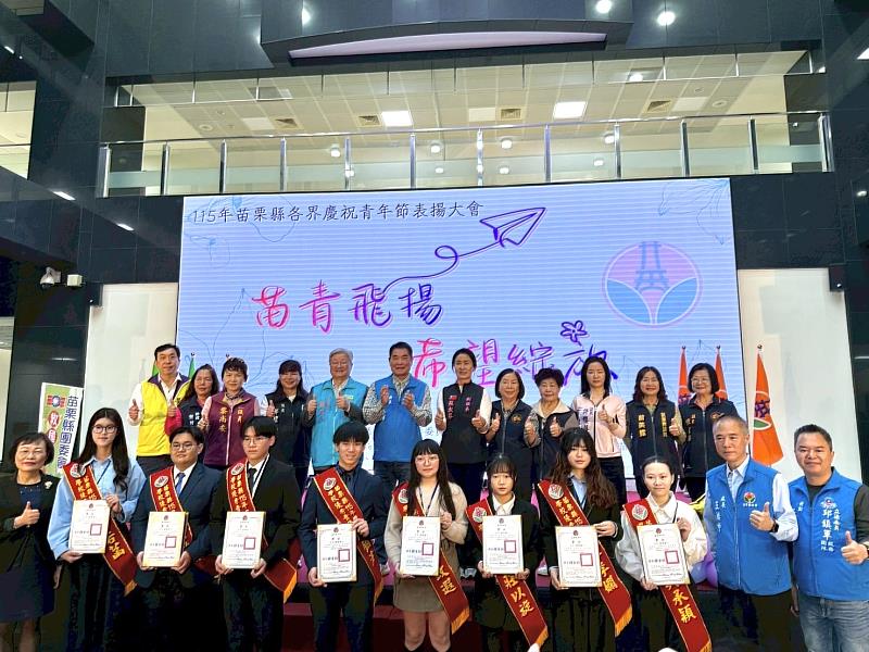 為慶祝115年青年節,由苗栗縣政府指導、苗栗縣救國團承辦的「苗青飛揚.希望綻放」優秀青年表揚大會,於3月27日在苗栗縣政府第一辦公大樓盛大舉行。縣長鍾東錦親臨現場,頒獎表揚共64位優秀青年,包含社會優秀青年30名、大專院校9名及高中職25名。今年獲獎名單亮點十足,涵蓋維護治安的警界楷模、傳承產業的製茶職人,以及在國際賽事奪金的校園菁英,充分展現苗栗青年接軌國際、深耕專業的強大競爭力。