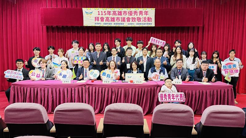(中央社訊息服務20260401 11:21:02)為慶祝115年青年節,救國團高雄市團委會辦理「優秀青年代表致敬團」活動,由高雄市團委會副主任委員陳正怡擔任團長,偕同指導委員廖其財及總幹事梁明峰,率領本市社會、大專校院及高中職優秀青年代表共42人,於3月30日下午前往高雄市議會拜會,由議長康裕成親自接見,並安排青年工作坊交流。透過實地參訪與深度對話,促進青年對公共事務的認識與投入。