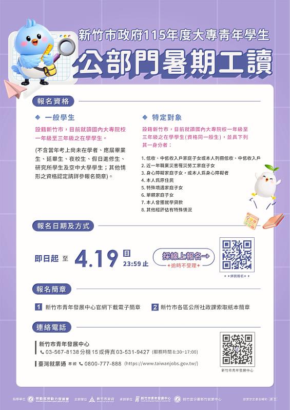 (中央社訊息服務20260401 16:44:23)新竹市政府今(115)年釋出103個暑期工讀名額,即日起開放報名至4月19日,歡迎設籍新竹市且符合資格的青年學生踴躍參與。市長高虹安表示,透過公部門工讀,讓青年朋友提前接觸職場、實際了解政府運作,並累積實務經驗,為未來職涯奠定基礎。