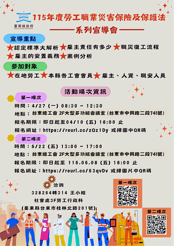 臺東縣政府強調,未來將持續結合中央資源,深化職業安全與勞動權益宣導工作,透過多元方式強化法規教育與服務,營造安全友善的職場環境,讓勞工安心就業、權益獲得完善保障。本活動採線上報名方式辦理,不開放現場報名,每場次限額50人,額滿為止,歡迎踴躍報名參加。相關資訊可透過報名連結https://reurl.cc/zQz1Dy、https://reurl.cc/53qvDv查詢,或洽臺東縣政府社會處勞工行政科(089-328254分機314)。