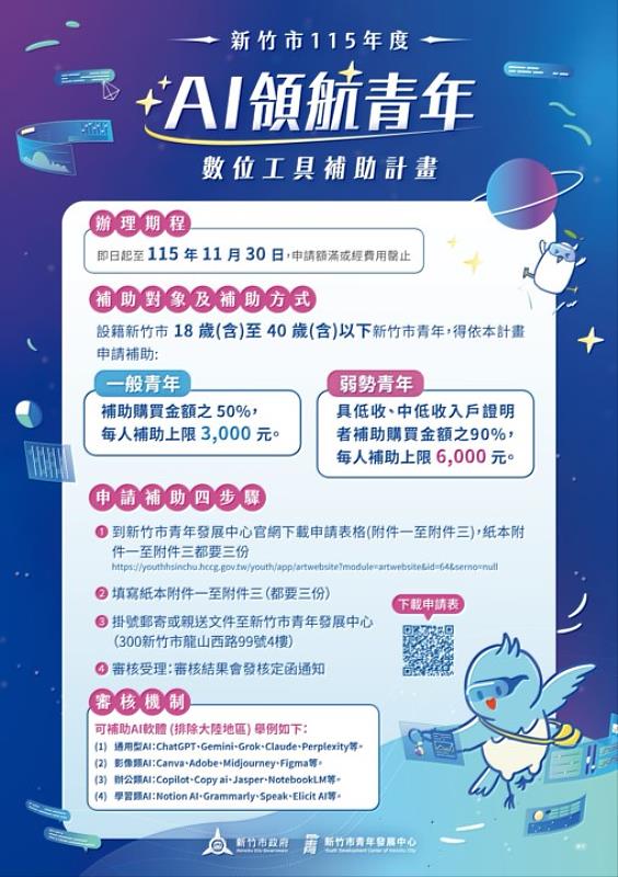 (中央社訊息服務20260402 10:34:31)人工智慧(AI)時代來臨,為鼓勵青年接軌數位科技浪潮,新竹市政府領先全國推出「AI領航青年數位工具補助計畫」,提供設籍新竹市18至40歲青年訂閱AI影音創作與數位工具,一般青年每人每年最高補助新臺幣3千元,低收或中低收入戶青年最高補助6千元。市長高虹安表示,協助降低青年學習AI的門檻與工具成本,強化數位應用能力,打造竹市成為青年數位創意與科技人才的重要基地。