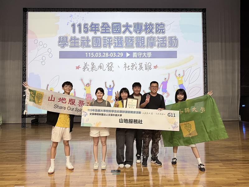 (中央社訊息服務20260402 16:52:48)文藻外語大學學生社團再傳佳績!文藻山地服務社參加教育部主辦「115年全國大專校院學生社團評選暨觀摩活動」,在全國116所大專校院、225個社團競逐下脫穎而出,榮獲「優等」肯定,展現文藻師生長期投入偏鄉服務的愛心與成果。