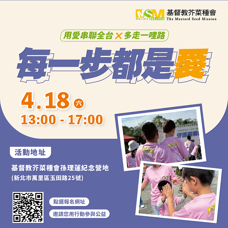 為促進家庭情感連結並關注兒少與家庭支持議題,基督教芥菜種會將於4月18日(六)13時至17時在新北市萬里區孫理蓮紀念營地舉辦「用愛串聯全台 × 多走一哩路」萬里場活動,以「每一步都是愛」為主題,邀請親子一同參與,在互動體驗中感受陪伴的力量。