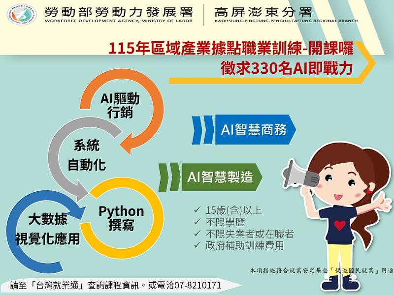 高屏澎東分署長郭耿華指出,年齡與專業背景並非跨入科技門檻的障礙,只要善用政府資源,透過系統化的職業訓練,能有效縮短產業轉型過程中的技術落差,不僅為個人開啟職涯可能,更為企業端導入具備AI素養的即戰力。因應區域產業特性,自4月下旬至9月推出AI訓練課程,無論是尋求轉職的待業者,或欲深耕AI技術的在職勞工,請把握機會,至「台灣就業通」網站(https://course.taiwanjobs.gov.tw/)查詢區域產業據點的課程資訊。如想進一步了解區域產業據點提供的服務,也歡迎與我們聯絡07-8210171。