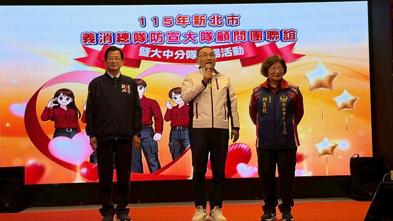 (中央社訊息服務20260408 10:33:11)新北市政府消防局於115年4月7日(星期二)18時30分,假雙岩幸福囍事會館舉辦「115年新北市義消總隊防宣大隊大中分隊表揚活動」,邀請防宣大隊及其顧問、中隊及分隊各級幹部與績優人員齊聚一堂,本活動並由侯友宜市長親臨主持,表揚防宣績優人員「金宣獎」31人,肯定防宣人員長期投入防災宣導的辛勞與貢獻,現場氣氛熱絡,充分展現防宣團隊凝聚力。