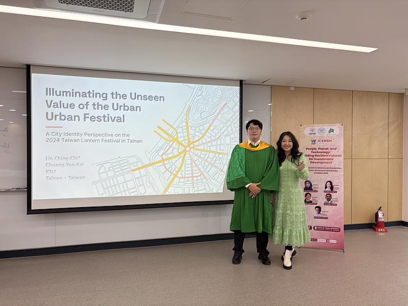 目前就讀企管所二年級的林敬祺,在此次研討會上用英文口頭發表論文,他以〈從城市認同觀點探討2024台灣燈會之社會價值實踐-以在地居民為例〉為主題,選擇2024年台灣燈會為研究個案,從城市認同觀點出發,探討節慶活動之整體效益及其社會價值實踐機制。近年相關研究逐漸指出,大型節慶活動除經濟效益外,其文化象徵意義、社會凝聚功能與公共價值內涵更值得深入探討,隨著城市競爭日益激烈,節慶活動已成為城市治理與文化政策中重要的發展策略,不僅具備促進觀光與經濟成長之功能,亦在形塑城市認同與實踐社會價值上扮演關鍵角色。
