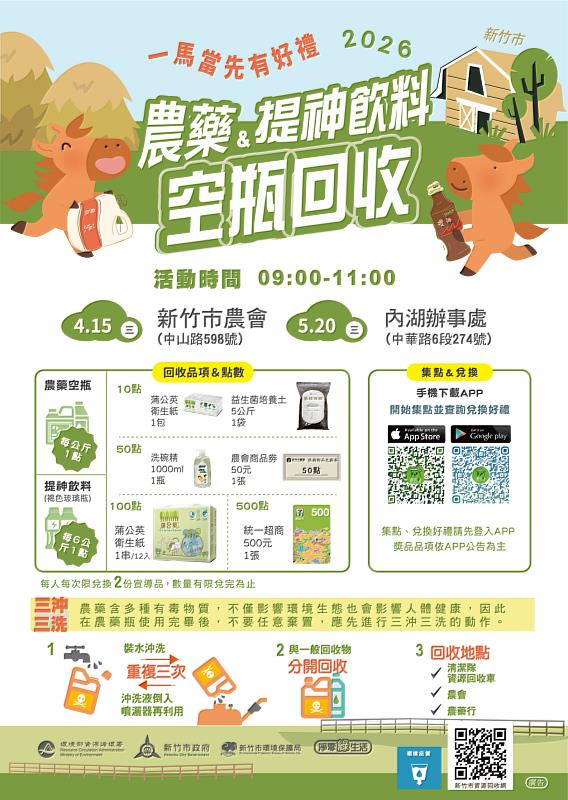 (中央社訊息服務20260410 09:58:38)為持續推動淨零綠生活、打造宜居永續城市,新竹市環保局啟動「春季農藥空瓶與提神飲料玻璃瓶回收行動」,將於今(115)年4月15日在新竹市農會(中山路598號)及5月20日於內湖辦事處(中華路6段274號)辦理,共計兩場次。環保局表示,此次活動時間為9時至11時,號召農民與市民踴躍參與,將耕作後的農藥空瓶與勞作後的提神飲料玻璃瓶妥善回收、轉化為環保資源,凡攜帶兩類指定回收物,即可透過「風收站APP」累積點數並兌換好禮,以實際行動落實資源循環。