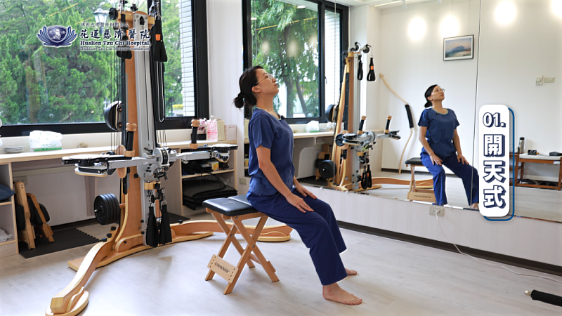 簡婕物理治療師提醒,進行嬋柔運動的時候,只要找一張穩固、沒有輪子的椅子,雙腳踩穩(建議穿著止滑襪或赤腳以防滑動),坐於椅子前三分之一處即可開始,而4招伸展分別是開天、旋轉、鐘擺以及波浪4式。