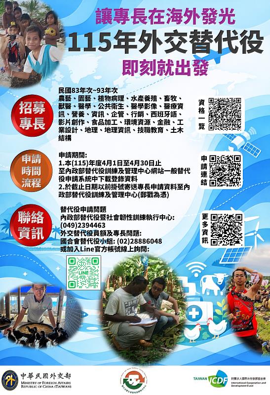 (中央社訊息服務20260413 10:49:44)由外交部委託財團法人國際合作發展基金會(國合會)辦理的115年度「外交替代役」專案計畫,自即日至4月30日開放報名。本年度預計招募80人至我國13個友邦及友好國家服務,涵蓋各項專業領域,歡迎符合資格之役男報名。