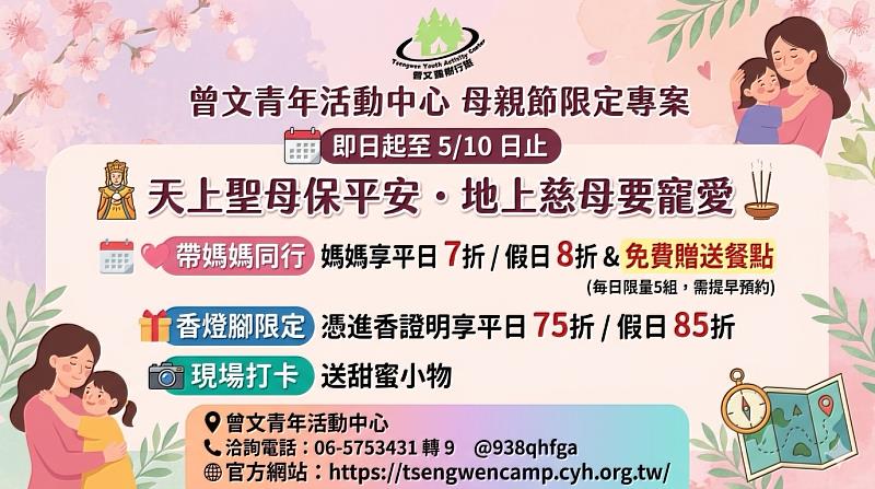 隨著春季旅遊熱潮升溫,加上母親節即將到來,不少民眾開始規劃結合感恩與放鬆的「母親節小旅行」。位於台南曾文水庫風景區的曾文青年活動中心(曾文露樹行旅),近期推出期間限定的「母親節暖心專案」,主打自然系療癒行程,吸引不少親子族群關注。